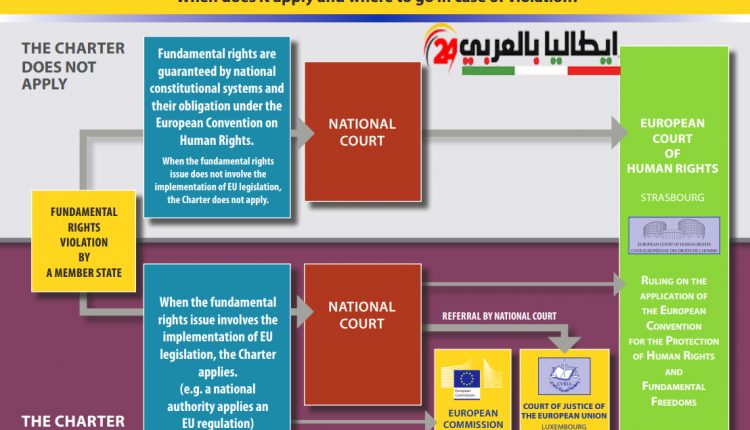 يكمل ميثاق الاتحاد الأوروبي للحقوق الأساسية ، لكنه لا يحل محل ، الأنظمة الدستورية الوطنية أو نظام حماية الحقوق الأساسية الذي تضمنه الاتفاقية الأوروبية لحقوق الإنسان.